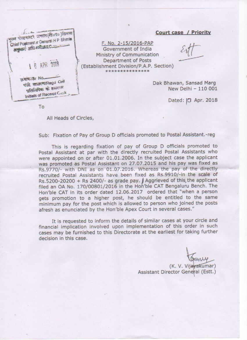 This is regarding fixation of pay of Group D officials promoted to postal Assistant at par with the directly recruited postal Assistants who were appointed on or after 01.01.2006. In the subject case the applicant was promoted as postal assistant on 27.07.2015 and his pay was fixed as Rs.9770/- with DNI as on 01.07.2016. whereas the pay of the directly recruited postal assistants have been fixed as Rs.9910/- in the scale of Rs.5200-20200 + Rs.2400/- as grade pay. Aggrieved of this, the applicant filed an OA No.170/00801/2016 in the Hon’ble CAT Bengaluru Bench. The Hon’ble CAT in its order dated 12.06.2017 ordered that “When a person gets promotion to a higher post, he should be entitled to the same minimum pay for the post which is allowed to person who joined the posts afresh as enunciated by the Hon’ble Apex court in several cases.”