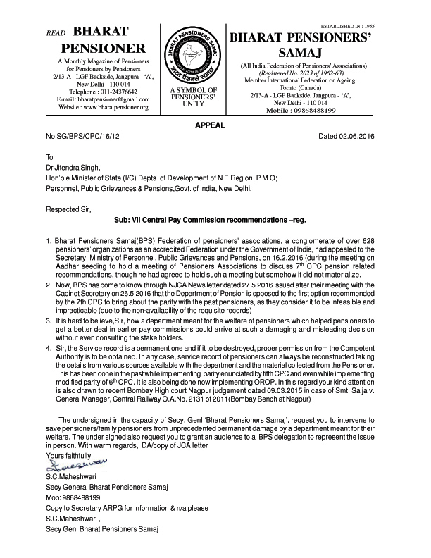 1. Bharat Pensioners Samaj (BPS) Federation of pensioners’ associations, a conglomerate of over 628 pensioners’ organizations as an accredited Federation under the Government of India, had appealed to the Secretary, Ministry of Personnel, Public Grievances and Pensions, on 16.2.2016 (during the meeting on Aadhar seeding to hold a meeting of Pensioners Associations to discuss 7th CPC pension related recommendations, though he had agreed to hold such a meeting but somehow it did not materialize.
